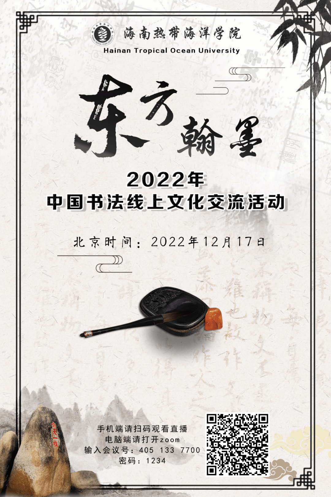 为贯彻落实党的二十大会议精神,讲好中国故事,传播好中国好中国声音,弘扬中华文化,发展华文教育事业,打造华文学生学习中华文化新平台,特开展海南热带海洋学院中国书法线上文化交流活动,现将有关事宜通知如下。 一、活动意义 活动以互联网为媒介,以书法为依托,充分挖掘书法相关元素,结合海南热带海洋学院学校特色。通过线上交流的方式,采用新科技展现中国书法,立体化呈现以中国书法为代表的中华文化,助力中国书法的海外传播,加强国内外文化交流互鉴,不仅让中国书法活在纸张上,同时也让中国书法以视频的形式活在互联网,促进中华优秀传统文化传播,增强中华文化凝聚力。 二、活动安排 1. 参与人员: 中国东盟国家合作院校师生 2. 活动名称: 《海南热带海洋学院中国书法线上文化交流活动》 3. 活动时间: 测试时间:北京时间2022年12月17日9:30~9:50; 直播时间:北京时间2022年12月17日10:00~12:00。 4.活动内容: 活动将以“东方翰墨”为主题,特邀书法老师参与课程设计,一起进行教学工作,用科技手段将海内外华人相聚在云端,带领学生参加线上活动,在80分钟的时间内带领学生参加线上活动,共享书法魅力。此次中国书法线上文化交流活动由书法历史介绍、书法作品欣赏、书法传承、书法教学、体验书法等环节,其中理论学习时间为30分钟,教学与体验环节为50分钟。将教、学、体验真正结合,通过一次活动,真正实现“学有所得、学有所思”,同时活动与生活中的实际应用相结合,做到学以致用。 5.参与方式: ⑴微信扫码参与: ⑵电脑端登录参与:操作指南见附件。 进入ZOOM平台听课会议号及密码: 会议号:405 133 7700 密码:1234 注意事项: 1.加入会议时请注明自己信息为“姓名-国家学校名称”; 2.请务必确保电脑上有连接麦克风及摄像头设备,笔记本电脑大部分自带有麦克风及摄像头。 操作指南