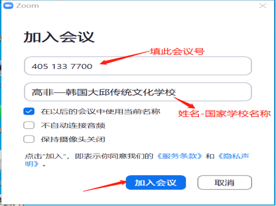 第三步:输入统一会议号:“405 133 7700”,输入自己名称“姓名-国家学校”,点击“加入会议”。